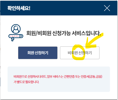 [신청하기] 버튼을 클릭하면 회원/비회원 신청하기 창이 뜹니다. 회원가입이 되어있지 않아도 [비회원 신청하기]를 통해서 발급 받을 수 있어요.