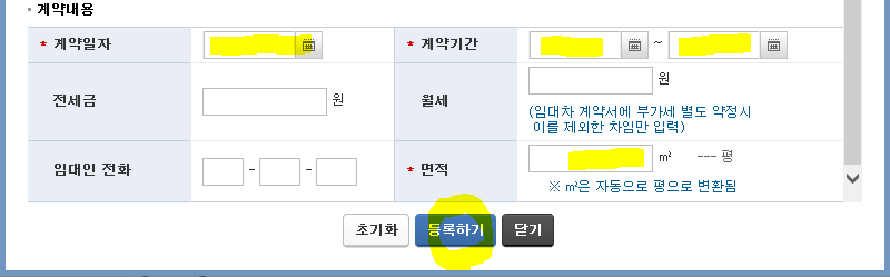 - 계약내용: 계약일자와 기간, 계약서 상에 표시된 임대한 공간의 전용면적을 입력
