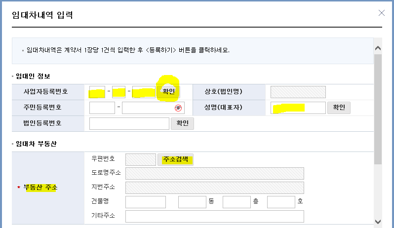 임대인이 개인사업자일경우 등록번호 입력, 법인사업자일경우 법인번호 입력 후 [확인] 클릭!