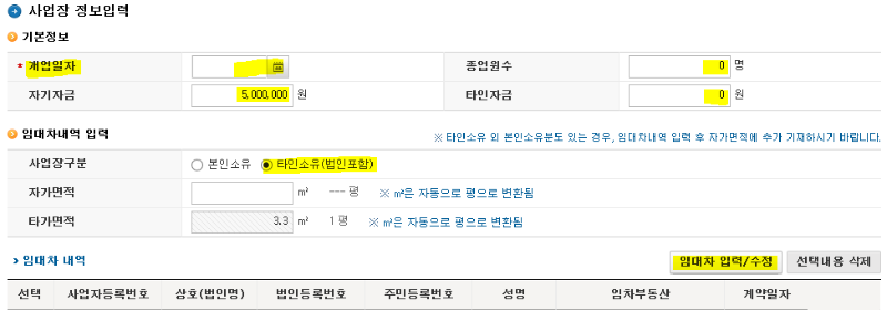 사업장구분: 타인소유(법인포함)에 체크 / 자가면적: 비워두세요.
